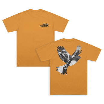 Honey gold t-shirt featuring Jalen Ngonda front breast pocket logo, with an image of Jalen within the outline of a Baltimore Oriole bird on the rear.